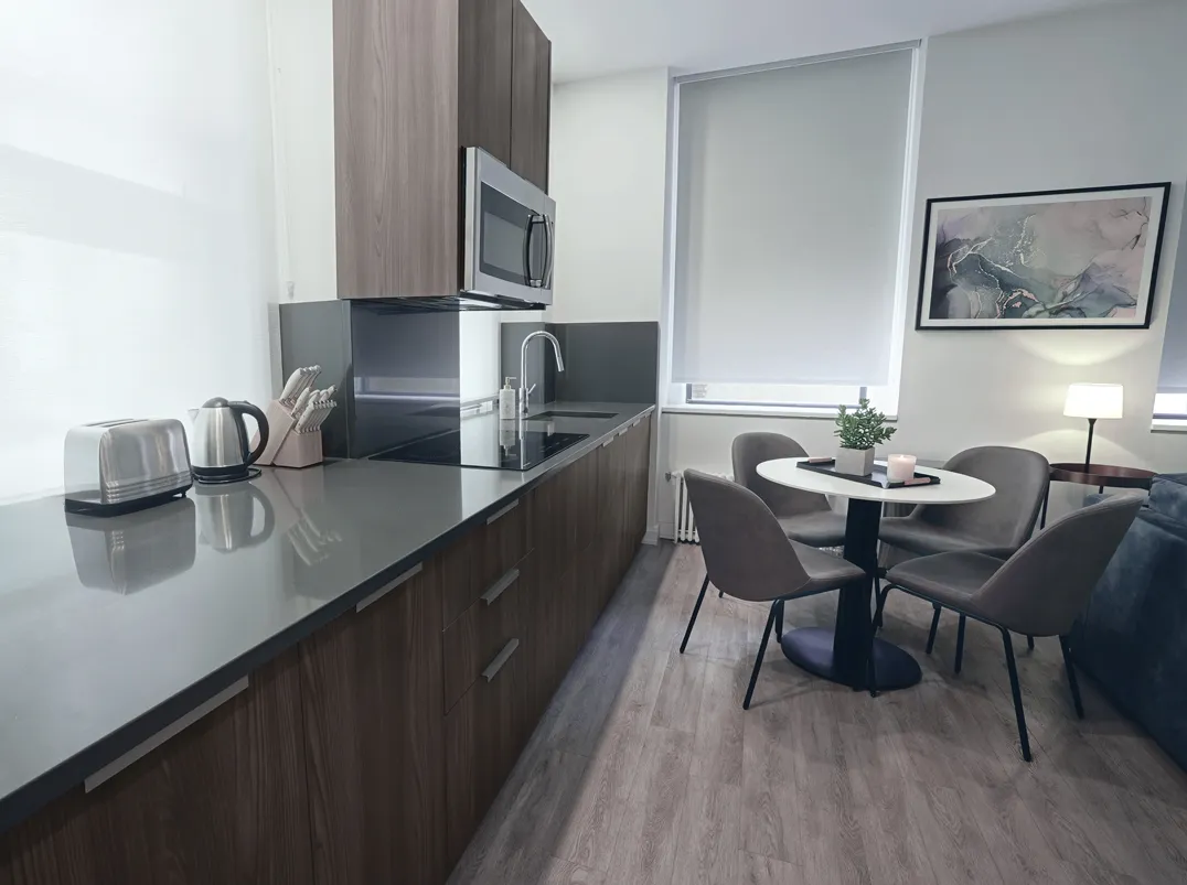 Compact yet fully equipped, the kitchenette features modern appliances and everything needed to whip up a quick breakfast or late-night snack.