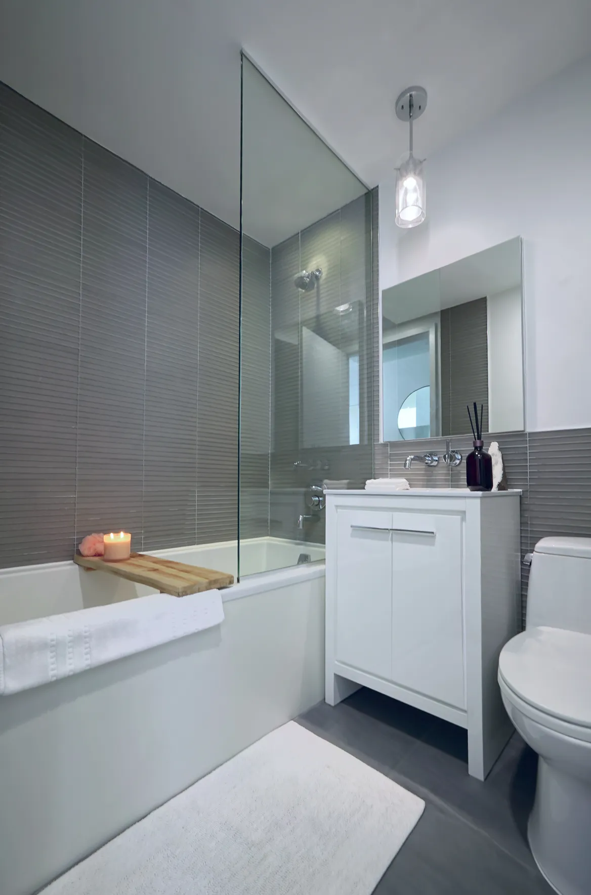 Sleek and modern, with a walk-in shower, premium fixtures, and plenty of counter space to make getting ready feel effortless.